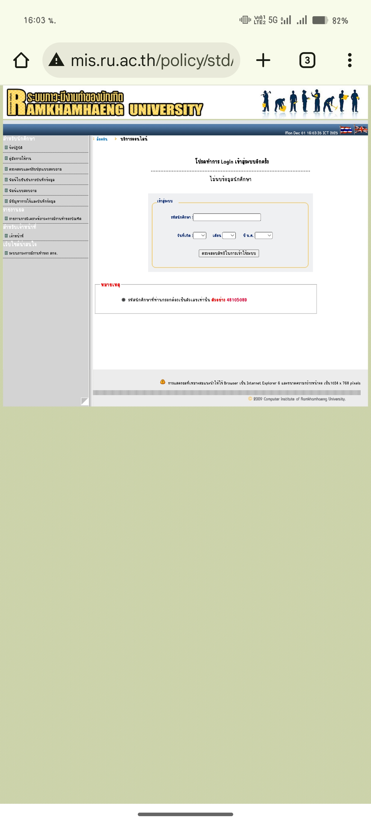 | รายละเอียด | จะแจ้งจบในเทอม1/68 นี้ค่ะ เลยจะเข้ากรอกภาวะมีงานทำ รหัสนักศึกษาคือ68 แต่พอเข้าหน้าล็อกอินกลับล็อกอินไม่ได้ ขึ้นไม่พบข้อมูลนักศึกษาต้องทำอย่างไรคะ |