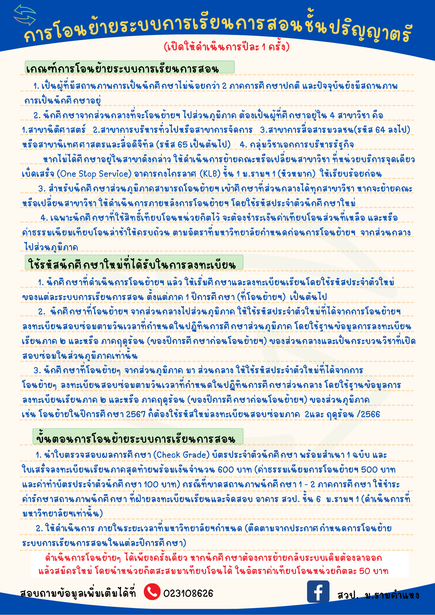 | รายละเอียด | โอนย้ายจากส่วนกลางไปส่วนภูมิภาค สามารถทำได้ช่วงเดือน พ.ค. ของแต่ละปีครับ (เปิดให้ดำเนินการปีละ 1 ครั้ง) ภาคฤดูร้อนต้องเรียนและสอบที่ส่วนกลางครับ สอบถามข้อมูลเพิ่มเติมได้ที่ 023108626 |