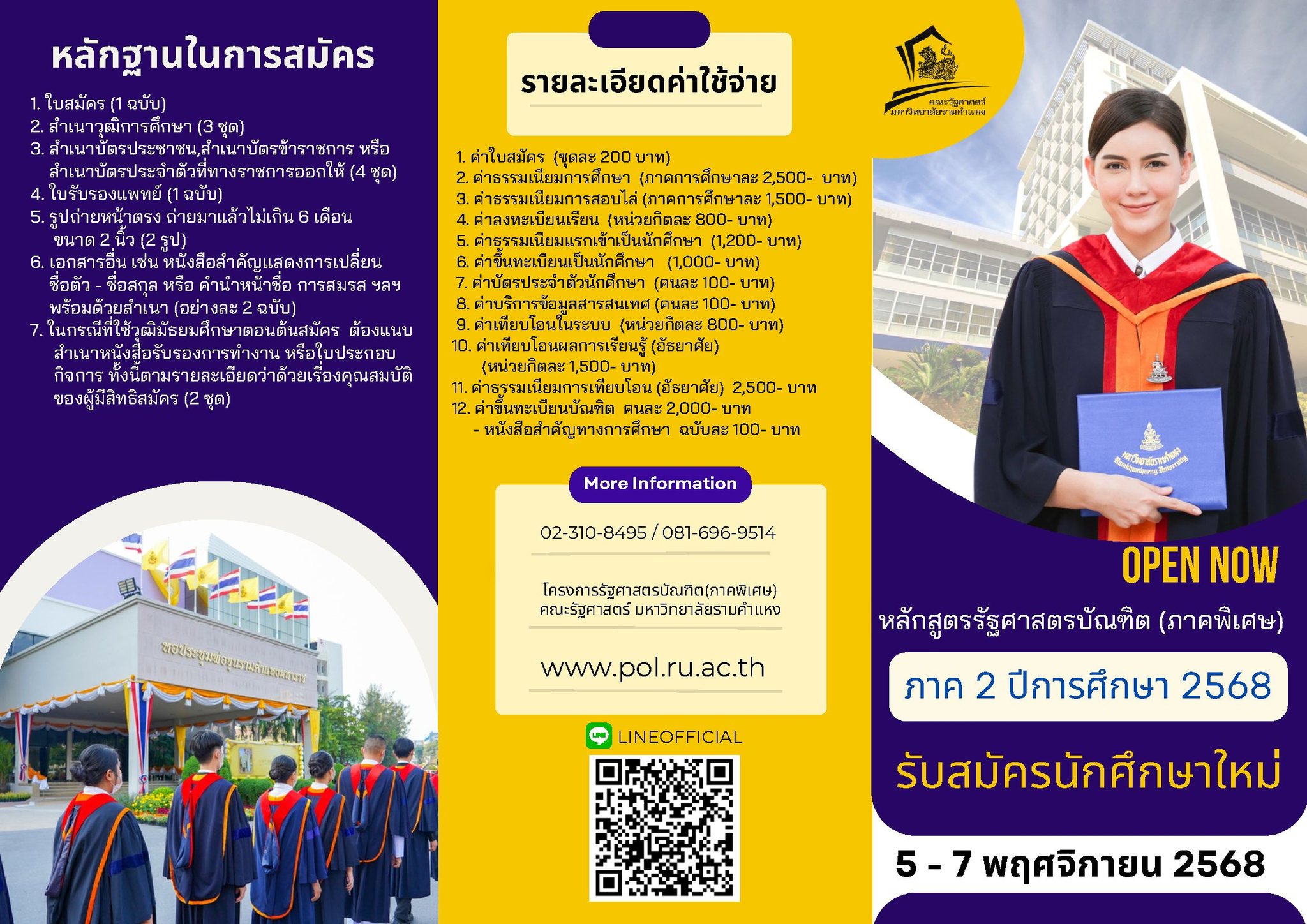 | รายละเอียด | เนื่องจากเป็นการสมัครเรียนในระบบการเรียนนอกเวลาราชการ (ภาคพิเศษ , โครงการพิเศษ ต้องสอบถามรายละเอียดการเรียนและการสอนจากทางคณะโดยตรงครับ) |