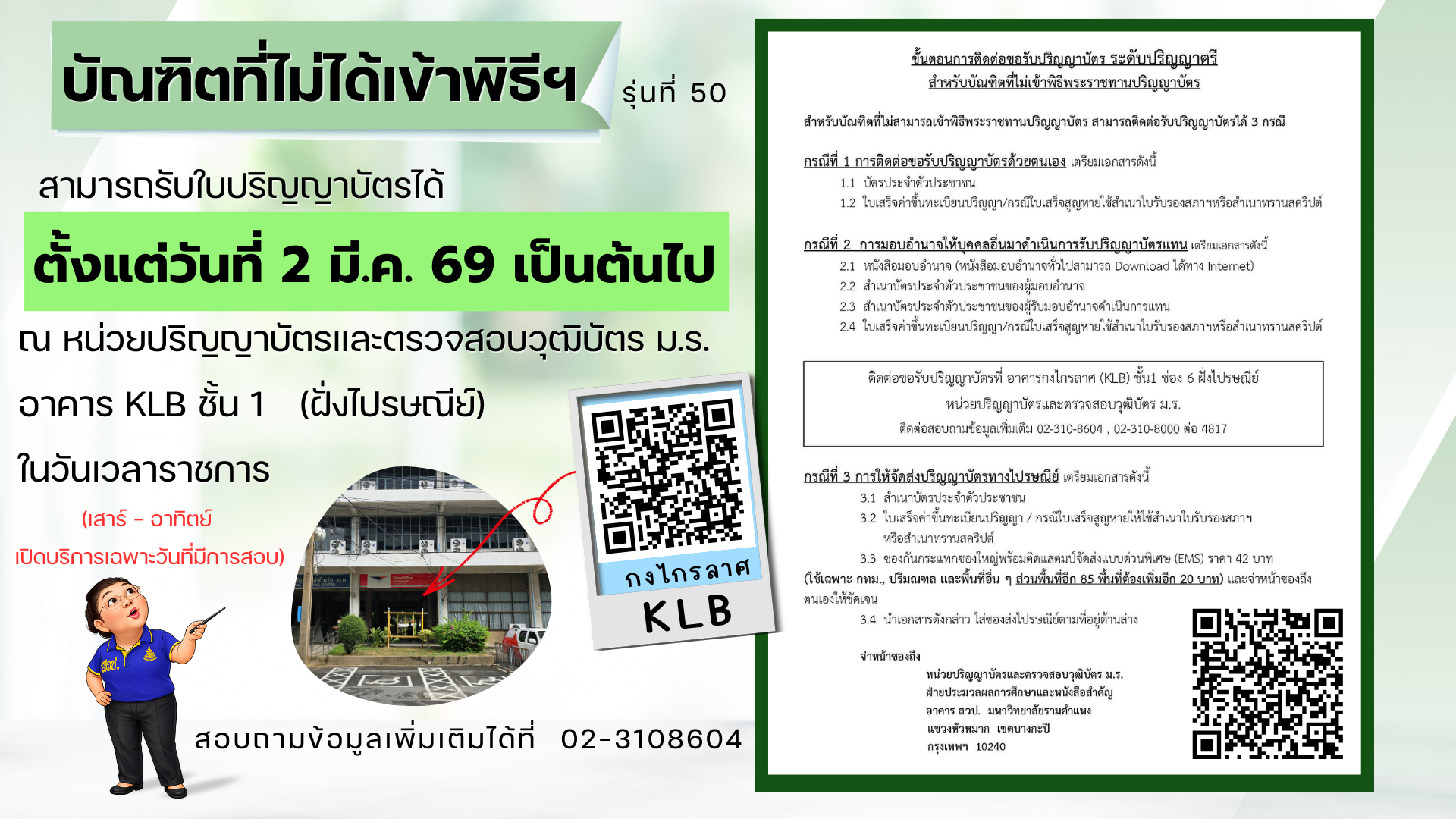 >>ติดต่อขอรับปริญญาบัตรที่ หน่วยปริญญาบัตรและตรวจสอบวุฒิบัตร ม.ร. อาคารกงไกรลาศ (KLB) ชั้น1 ช่อง 6 (ฝั่งไปรษณีย์) ติดต่อสอบถามข้อมูลเพิ่มเติม 02-310-8604 , 02-310-8000 ต่อ 4817