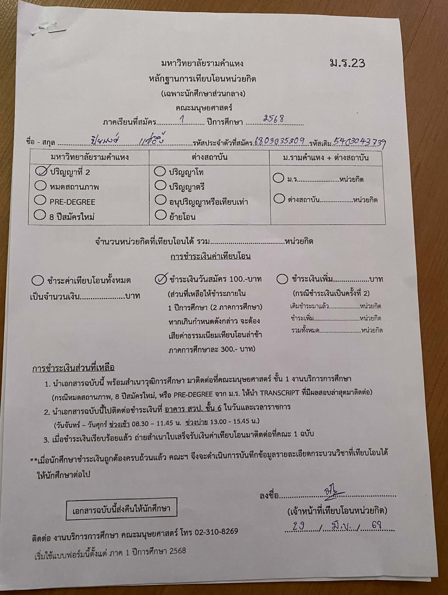 | รายละเอียด | 1.ย้ายคณะ (ค่าธรรมเนียม 200 บาท) และติดต่อคณะรัฐศาสตร์ เพื่อคำนวณ และ ชำระค่าเทียบโอน 2.ลาออก และ สมัครใหม่ ภาค1/2569 (ค่าสมัครใหม่ประมาณ 3,800 บาท + ค่าเทียบโอนหน่วยกิตละ 50 บาท) สอบถามข้อมูลเพิ่มเติมได้ที่ 02-310-8614 ครับ |