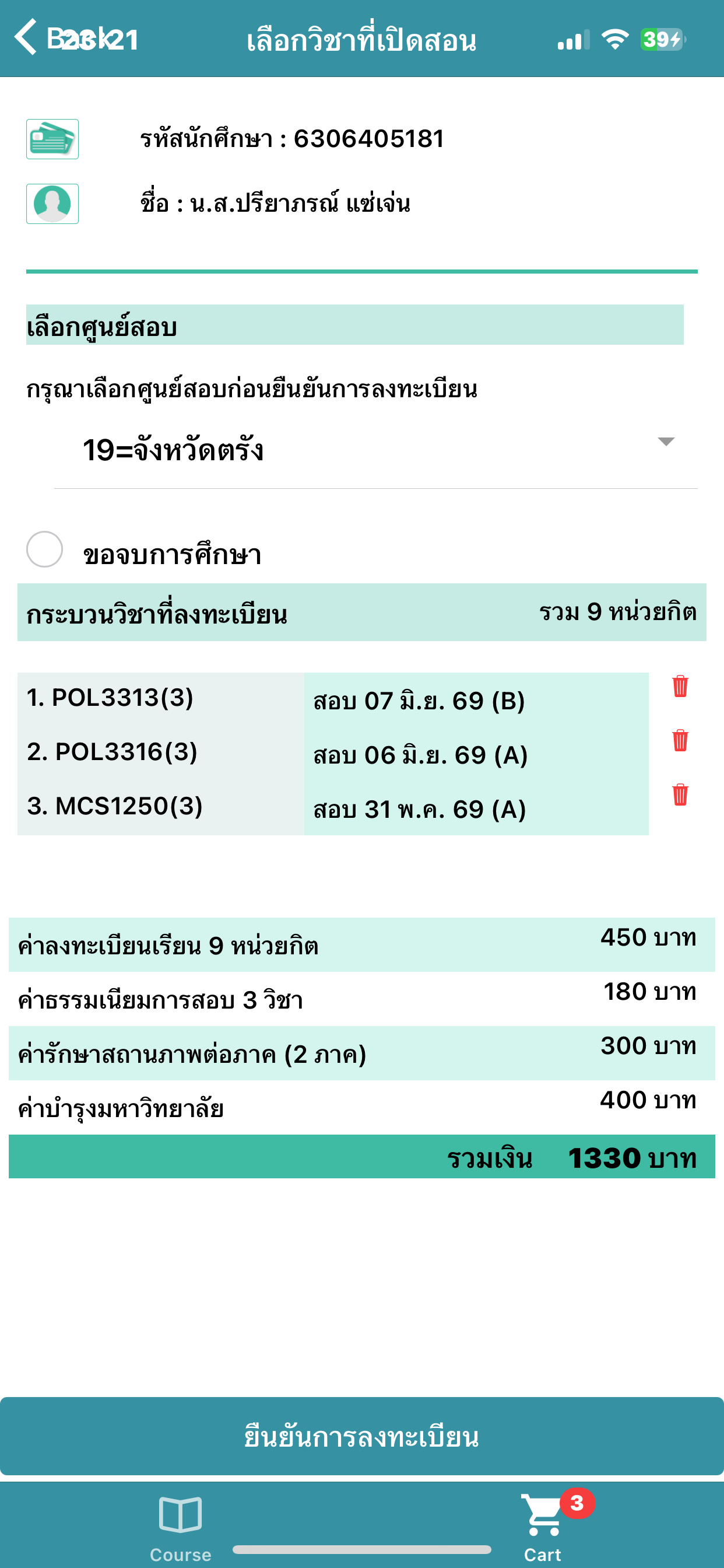 | รายละเอียด | ขอเอกสารแนบใบเสร็จลงทะเบียนเรียนภาค 2/2568 เพิ่มเติมด้วยค่ะ เพื่อใช้ในการตรวจสอบข้อมูล |